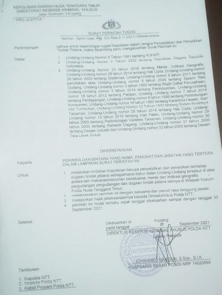 Surat perintah tugas tertanggal 1 September 2021 dan ditanda tangani oleh Direktur Reserse Kriminal Khusus Polda NTT, Kombes.Pol.Johanes Bangun, S.Sos, S.I.K.