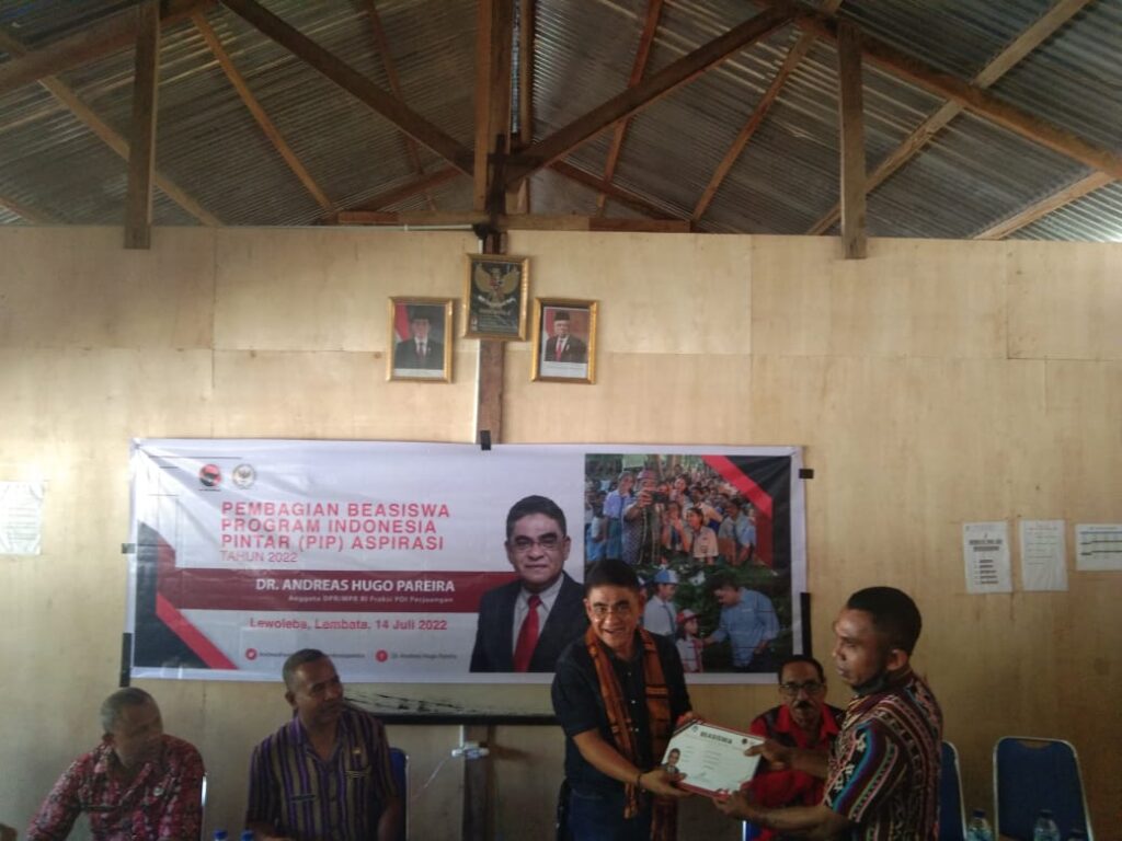 LEMBATA – Anggota DPR RI Fraksi PDI Perjuangan Andreas Hugo Pareira membagikan Beasiswa Program Indonesia Pintar (PIP) Aspirasi tahun 2022 untuk peserta didik di Kabupaten Lembata.