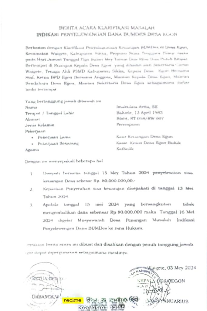 “Jika pada tanggal 13 Mei, dirinya datang menyampaikan bahwa di tanggal 15 Mei tidak bisa mengembalikan, maka Pemdes Egon akan mengeluarkan undangan untuk Musyawarah Desa di tanggal 16 Mei 2024 dan proses selanjutnya sesuai hukum yang berlaku,” tegas Kades Egon.