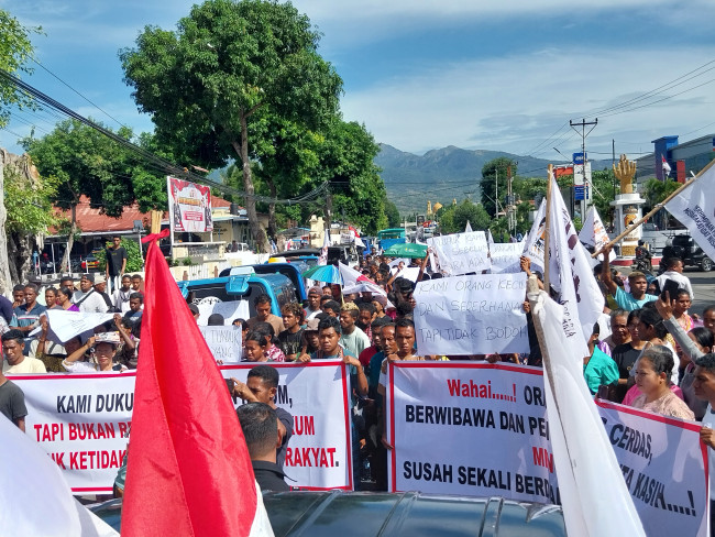 FLORESPEDIA.ID- Ratusan masyarakat adat Tana Pu’an Suku Soge Natarmage dan Tana Pu’an Goban Runut bersama Aliansi Masyarakat Adat Nusantara (AMAN) Flores Bagian Timur pada Rabu (3/7/2024) pagi, menggelar aksi damai di Kota Maumere, Kabupaten Sikka yang dilakukan di Mapolres Sikka, Kantor Badan Pertanahan Nasional (BPN) Kabupaten Sikka dan Kantor Bupati Sikka.