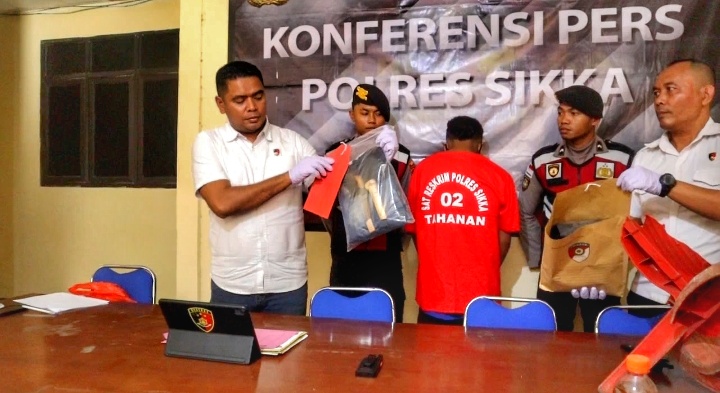 Dalam konferensi pers tersebut, Polres Sikka menampilkan tersangka berinisial Anjelo atau ANM (25) beserta sejumlah barang bukti yang digunakan dalam aksi penganiayaan.