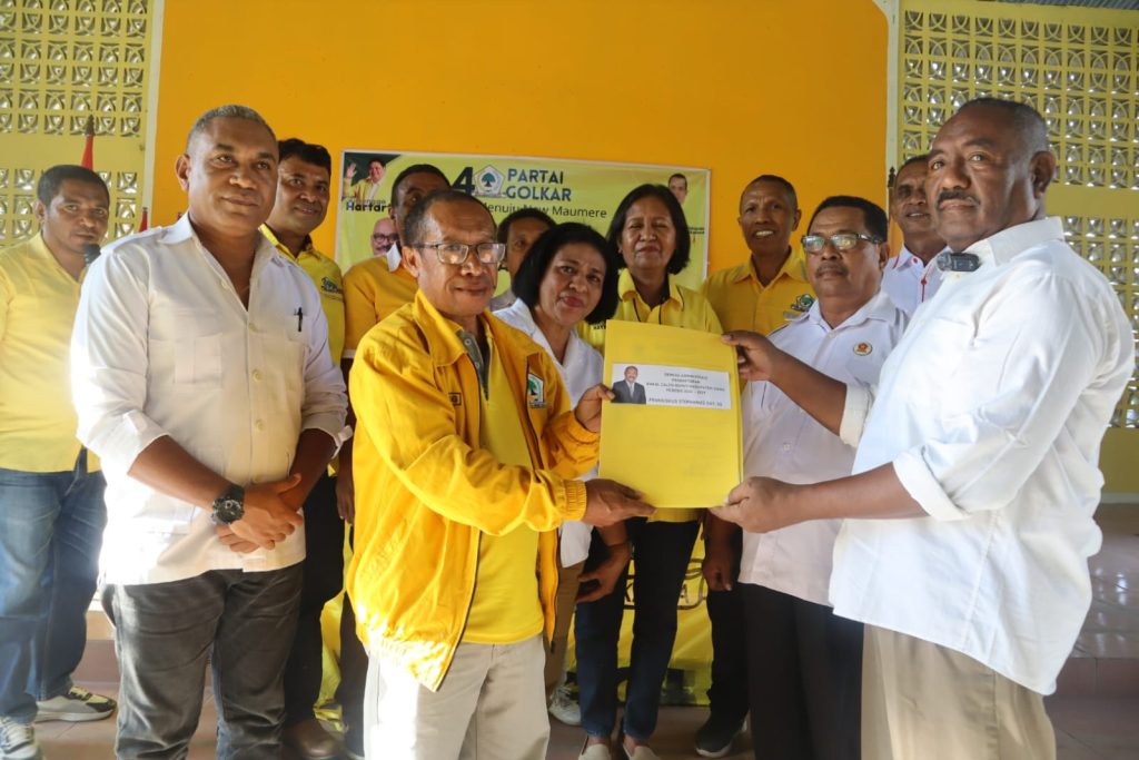 Keterangan foto:Bakal Calon Bupati Sikka, Fransiskus Stephanus Say menyerahkan berkas pendaftaran dan diterima Sekretaris DPD Golkar Sikka Nafarete Situ Mekeng, Kamis (9/5/2024) sore.
