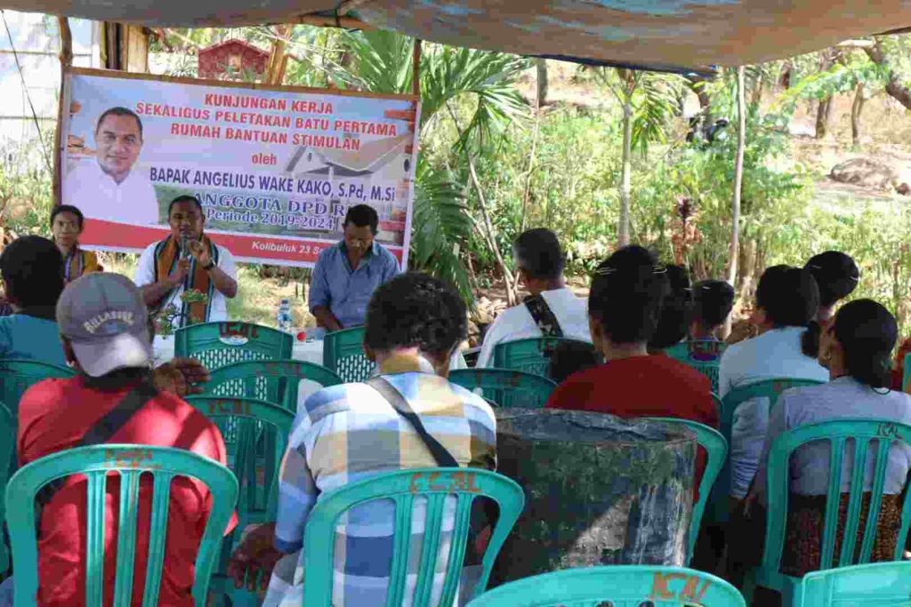 MAUMERE-Anggota DPD RI, Angelius Wake Kako pada Sabtu (23/9/2023) siang, melakukan kunjungan kerja peletakan batu pertama pembangunan rumah program BSPS di Kolibuluk, Desa Hoder, Kecamatan Waigete, Kabupaten Sikka.